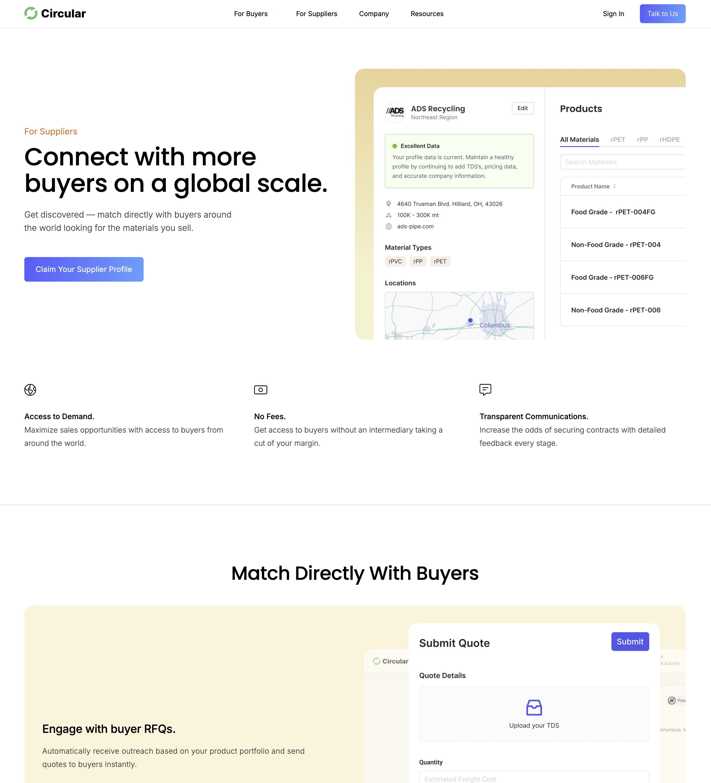 Circular.co created a platform built on AI technologies to help buyers and suppliers of sustainable and next gen materials transact. I was responsible for leading the user experience of all digital products and go-to-market materials.
